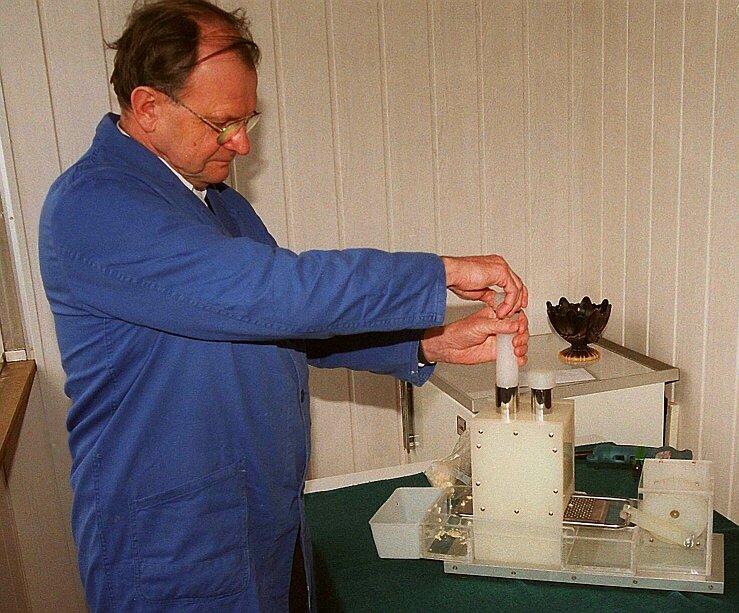 Hermann Hettich mit seiner Erfindung, dem elektronischen Meerrettichhobel