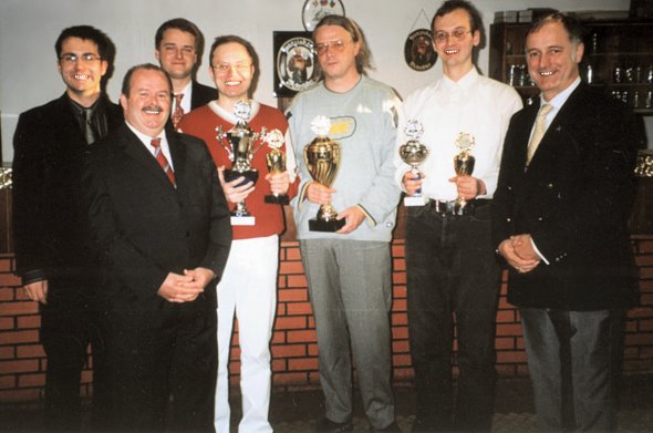 Mittelbadischer Einzel-Blitz (v.l.n.r.): Markus Merklinger (Caissa Rastatt), Herr Tremmel (Sponsor Volksbank Rastatt), Tobias Lauckner (Caissa Rastatt), FM Hartmut Metz (Rochade Kuppenheim, 3. Platz), GM Ludger Keitlinghaus (SC Baden-Oos, 1. Platz), Robert Miklos (Rochade Kuppenheim, 2. Platz), Klaus Harsch (Caissa Rastatt).