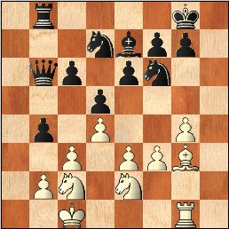 1.d4 Sf6 2.Lg5 Der Trompovsky-Angriff ist eine Spezialität von Weiß. 2..c6 3.Sc3 d5 4.f3 Lf5 5.e3 h6 6.Lh4 e6 7.Ld3 Lxd3 8.Dxd3 Sbd7 9.Sge2 Le7 10.0-0-0 0-0 11.g4 b5 12.Lg3 a5 13.Tdg1 a4 14.Sd1 Db6 Des "Generals" erster Befehl lautet: "Die Springer ziehen wie die Läufer". 15.c3 Tfb8 16.Sc2! b4?? 17.Dh7+!! Der Springer auf f6 kann die Dame nicht nehmen, weil er wie an Läufer zieht und der Springer c2 deckt de Dame! Nach 17..Kf8 käme sofort Dh8 matt. Guter Rat ist also teuer. Doch schon mancher flehentliche Blick hin zum "General" hat Wunder gewirkt. Beflissen eilt der unumstrittene Herrscher über Sieg und Niederlage herbei und verkündet mit einem triumphierenden Grinsen hin zu Weiß, der bei diesem Turnier schon viele graue Haare bekommen hat: "Alle Figuren die auf der a- und der h-Linie stehen sind vom Brett zu nehmen" (siehe Diagramm).